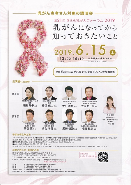 6月は、わたしが参加する患者さん向けの大きな会がふたつあります。 ひとつは、きららの会が毎年主催している、「乳がんフォーラム」で、もう21回になります。 6月15日(土)に開催されます。 この会は、毎年参加希望者が多く、申し込み受け付けとすぐに、満席となります。 今年もすぐに受付終了となったようです。 もし、多くの先生の話を聞きたいというかたは、来年、受付と同時に申し込むか、10月に「広島乳がんアカデミア」という会も開催されますので、楽しみにしていてください。 もうひとつは、毎年おこなっている「リンパ浮腫講習会〜リンパ浮腫 予防の主役はあなたです!〜」です。 これも、今回で15回になります。 6月2日(日)10:00〜13:00JR広島病院で開催されます。 この会は、事前申し込み不要で、参加費無料です。 リンパ浮腫にならないための予防法や、なった後の治療についての内容です。 昨年新しいガイドラインが作成され、予防のための注意事項や、発症リスクなど注目を集める重要ながんの治療に伴う合併症・後遺症ですので、しっかりと学んでおきましょう。